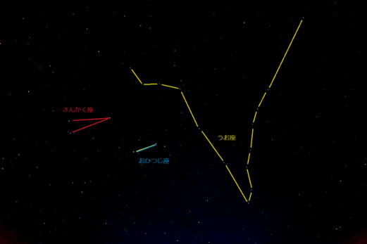 ■うお座/おひつじ座/さんかく座です。秋の夜の高い位置に見えます。